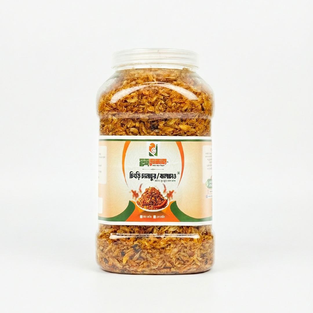 এই বালাচাও / চিংড়ি চানাচুর তৈরি করা হয়েছে বাছাইকৃত নদীর চিংড়ি দিয়ে। নদীর চিংড়ি সাধারণত মাটি খায়, তাই এর ভেতরে বালু জমে না—যেটা অনেক সময় সাগরের চিংড়িতে দেখা যায়। এই কারণে খেতে পরিষ্কার ও আরামদায়ক লাগে। এটি চট্টগ্রামের ঐতিহ্যবাহী খাবার, যা ছোট চিংড়ি শুটকি, পেঁয়াজ, রসুন এবং প্রায় ৩০ প্রাকার দেশিয় মাসালা,অতুলনীয় কম্বিনেশনে তৈরি হয়।